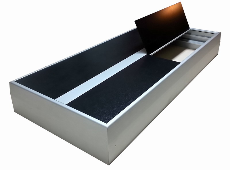 Mindössze 10mm vastagságú akvárium tető, akár NANO akváriumra is. Néhány könnyed mozdulattal nyitható és bontható. A belső kb. 22 x 22cm él hosszúságú fekete betétlemezekből pedig annyit emelünk ki az akvárium tetőből, amennyi a kényelmes munkavégzéshez szükséges. Középső eloxált alumínium merevítőben, szennyeződésvédő lap mögött, beépített LED világítás foglal helyet. Az akvárium tető az üveglapok között helyezkedik el, egy szintben az akvárium üveg peremével. Ezáltal rendkívül légies, könnyed megjelenésű. TIPP: oldal üveglapokra vízszinttakarás, öntapadó fekete fóliával megoldható. Megrendeléskor meg kell adni az akvárium alapterületének méretét és az üvegvastagságot.