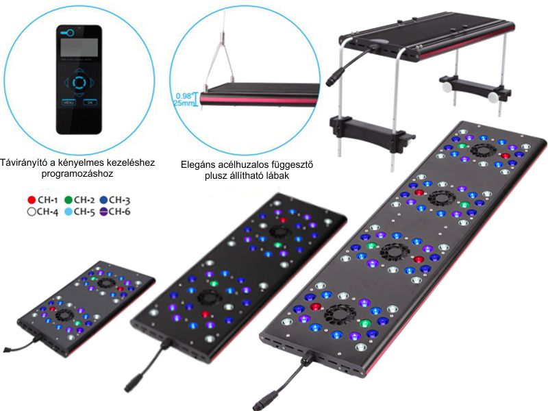 Széles spektrumú akvárium LED világítás, kis és közepes fényigényű növényes és halas akváriumok világításához. A világítás alapja 6000K, a delelő nap összetett fehér fénye. Az akvárium LED világítás, kísérletekben igazoltan csökkentette az algaképződést, összetett napfény spektruma elősegítette a növények növekedését.